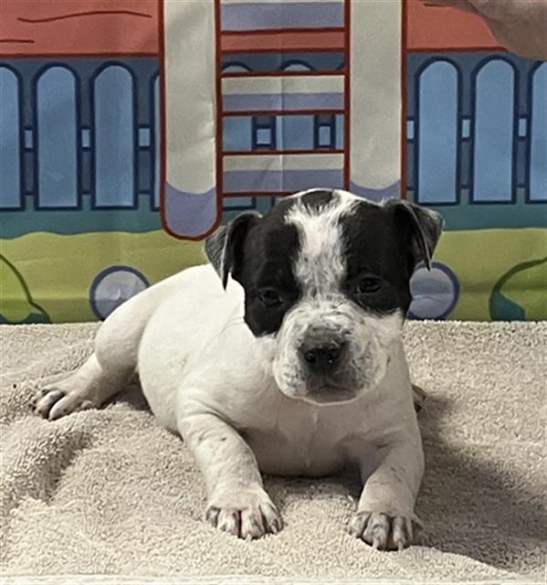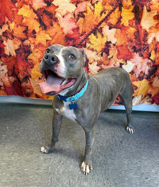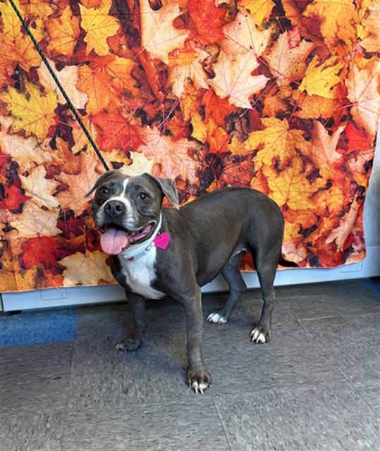 The shelter named me Chub Chub. I am a 7 year old female gray & white Staffordshire Bull Terrier Mix. I have been at the shelter since Friday, August 29, 2025. Must provide proof of home ownership or landlord approval at the time of adoption.