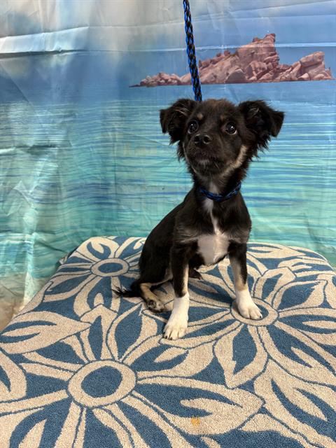 The shelter named me Blueberry Scone. I am a 6 month old male tricolor Papillon Mix. I have been at the shelter since Wednesday, July 23, 2025. Must provide proof of home ownership or landlord approval at the time of adoption.