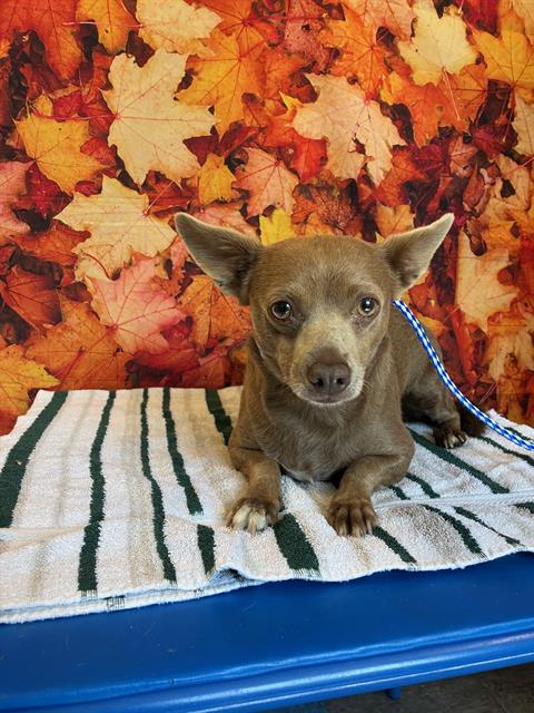The shelter named me Carmel. I am a 9 year old female brown Chihuahua - Smooth Coated Mix. I have been at the shelter since Friday, August 1, 2025. Must provide proof of home ownership or landlord approval at the time of adoption.